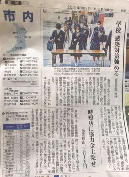 大阪に緊急事態宣言を受け、「読売新聞」に本校の正門での感染予防策が取り上げられています。
