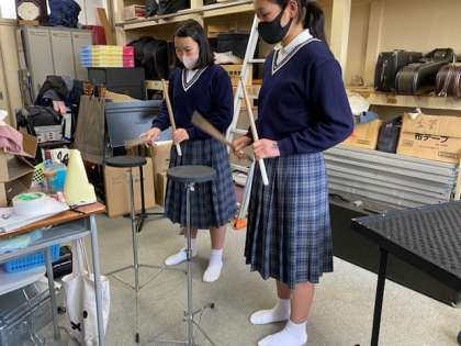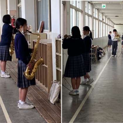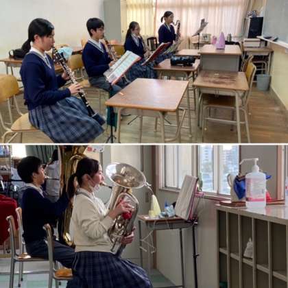 部活動も新型コロナウイルス感染対策による「新しい生活様式」を踏まえ、個人や少人数でのリスクの低い活動での活動に限定して吹奏楽部も取り組んでいます。