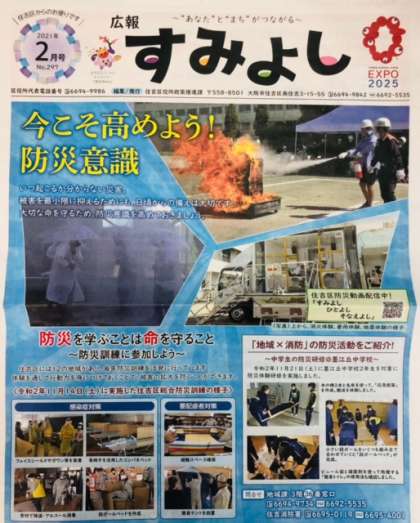 今月号の広報「すみよし」に、昨年夏に、本校生徒とお笑い芸人、また元セレッソ大阪住吉区アンバサダーの方と大阪市消防学校に行きました災害訓練の様子が記載されています。