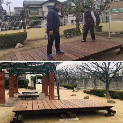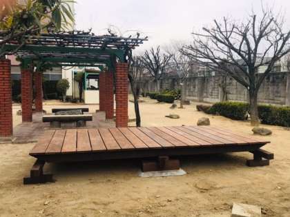 学校、藤棚の横にジャイアントシーソーが設置されました。