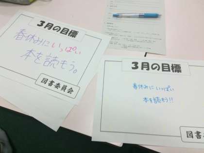 話し合いの結果、図書員会では、目標として「春休みにはたくさんの本を読もう」に決まりました。
