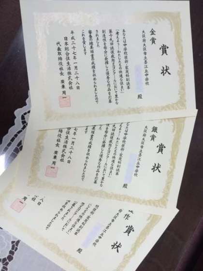 応募総数は、全国で6200点で、その内10人の全体入選者のうち、本校では金賞、銀賞、佳作と3つの賞を頂きました。