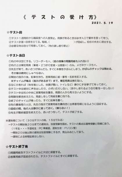 今日は1年生は、テストの受け方等の注意事項の伝達が行われました。