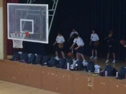 写真3-女子バスケット部 ステージの上でドリブル練習をしました。
