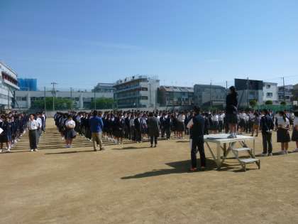 今日は、休み明けの青空の下、週はじめの全校集会が行われました。