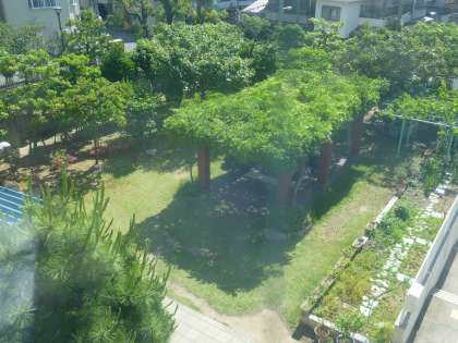 学校園の緑が一層深くなってきました。藤棚も緑が生い茂りちょうどいい木陰ができています。