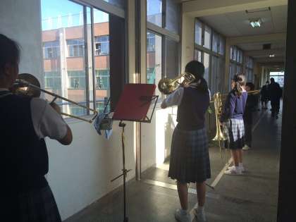 吹奏楽部では、30人の新入部員が音出しの特訓中です。