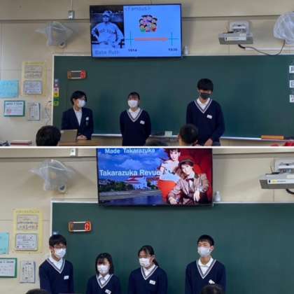 英語のプレゼンテーションの英語力と社会科の歴史をコラボした学びを行いました。