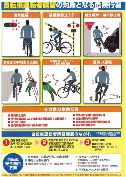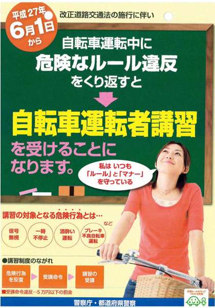 6月1日より、道路交通法改正にともない、自転車も違反に対しては、取り締まりの対象となりました。