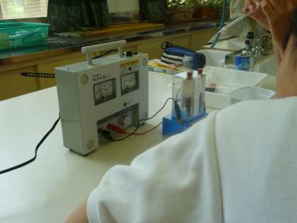 これは、塩酸を水素と塩素に電気によって分解し、それを確かめるものです。