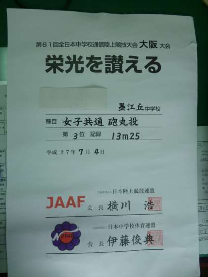 今日の表彰伝達では、「陸上部」の女子砲丸投げで、全国中学出場が決まったことが報告されました。