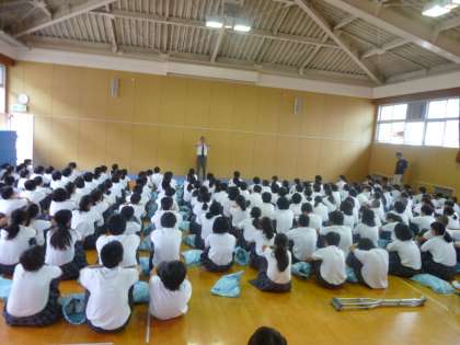1年生では、初めての夏休みで、集会で全体の話を聞きました。(写真1)