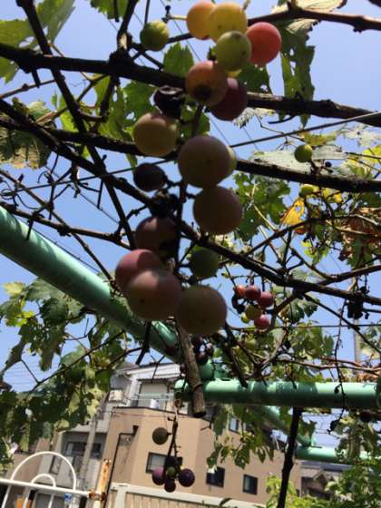 学校園、ぶどう棚のぶどうが熟して、食べごろになっています。