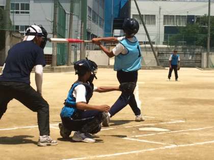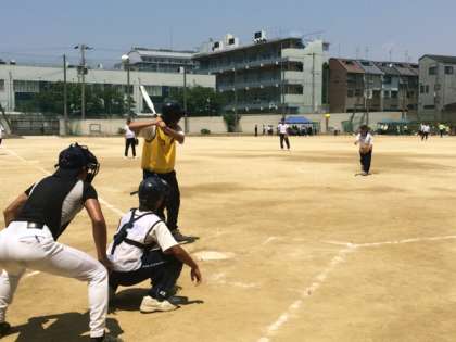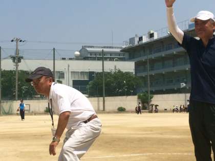 PTA会長と校長による始球式の後、二手に分かれて試合開始です。