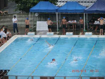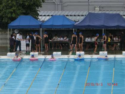 1年生の水泳大会は、雨も降ってきましたが、競技は天候を見ながら続けられました。