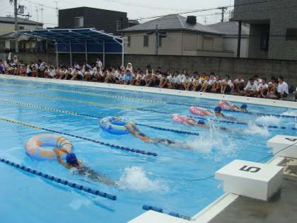 種目の中には、競泳ばかりでなく、浮き輪を使って人を助ける「レスキュー大作戦」(写真2.3)など、レクレーション的な競技もありました。