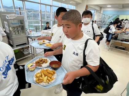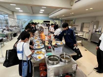 食事はビュッフェ形式!サラダに淡路島名物の玉ねぎサラダにオニオンスープ、ナゲットにポテトなど、デザートにプリンまである豪華な食事でした。