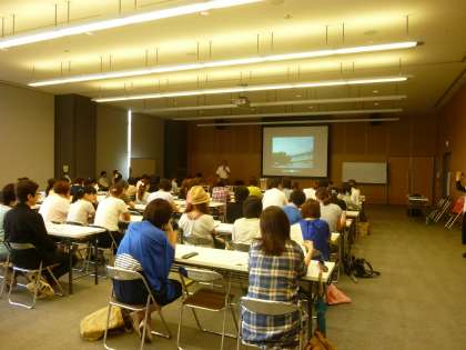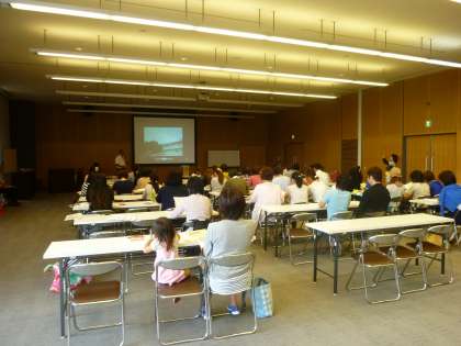 ホールいっぱいの保護者の方々が熱心にお話を聞いておられました。