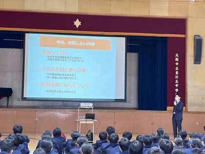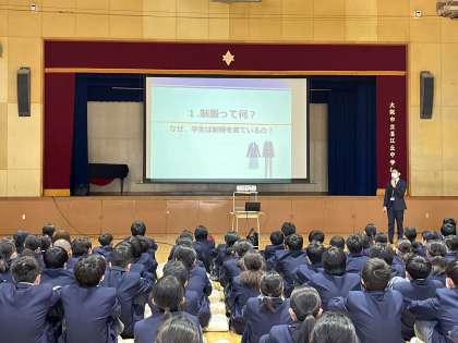 本日4限に菅公株式会社の方に来ていただき、制服の意味や着こなしについて、ご講演いただきました。制服を着用することで、「役割」や「所属」が一目でわかり自覚が生まれることや、オフィシャルウェアである制服は、他人から見てどう思われるかのかを意識することが大切であることを教えていただきました。