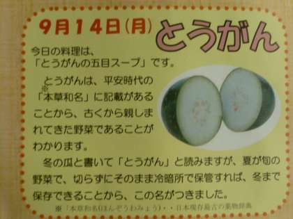今日の給食は「冬瓜(とうがん)の五目スープ」です。