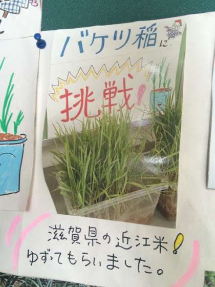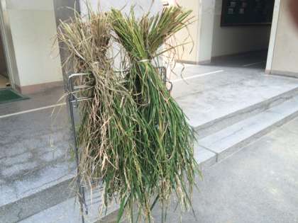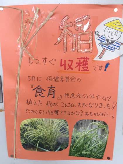 5月に保健委員会で、植えていましたバケツ稲が収穫を迎えました。