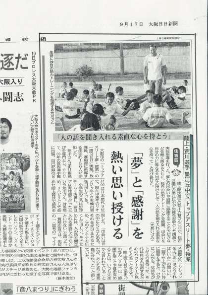 大阪市の「夢プロジェクト事業−トップアスリート夢授業」で本校に来校された荒川選手の講演の様子が、新聞に大きく掲載されました。
