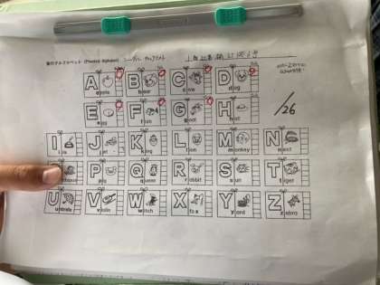 1年生の英語のぐるぐるテスト(アルファベットの音読みテスト)の風景です。
