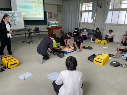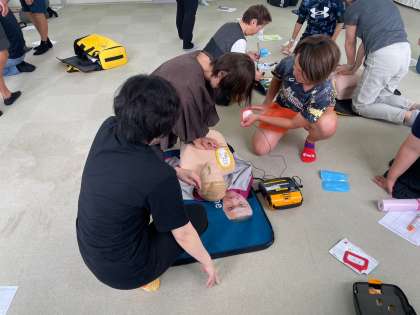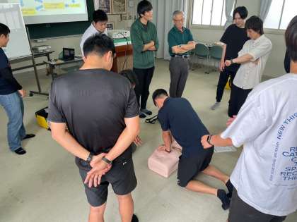 AED講習会では教職員で救急車が来るまでの約8分間を体験しました。