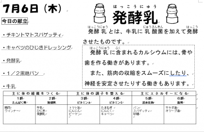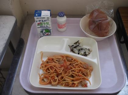 本日の給食は、夏野菜のトマトとピーマンやにんじんがたくさん入った「チキントマトスパゲッティ」などをおいしくいただきました。