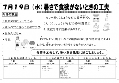 1学期の最終回で汗をかきつつ、今日も元気の出る給食となりました。給食業務に携わっていただいてる全ての方に感謝申しあげます。ごちそうさまでした。ありがとうございました。