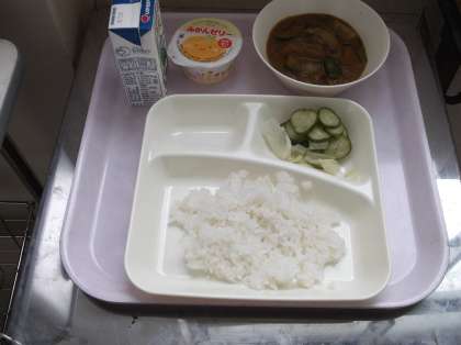 本日の給食は、かぼちゃ・なす・トマト・ピーマンなど夏野菜のカレーライスとキャベツ・きゅうりのサラダなどをおいしくいただきました。