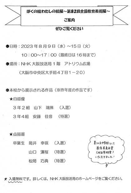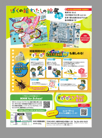 8月9日(水)〜15日(火)、NHK大阪放送局(中央区大手前4-1-20)で本校の在校生と卒業生の作品(昨年度分)が展示されます。ぜひ、ご覧になってください。