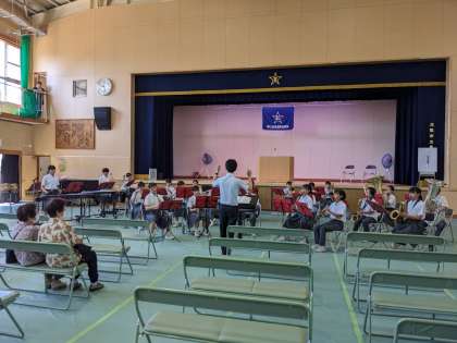写真は会場の様子です。吹奏楽部はリハーサルの様子です。