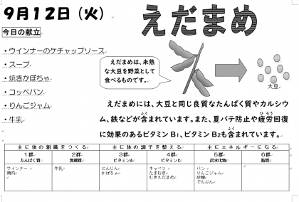 本日の給食は、次の通りです。 えだまめの効能が紹介されていますので、ご参考にしてください。