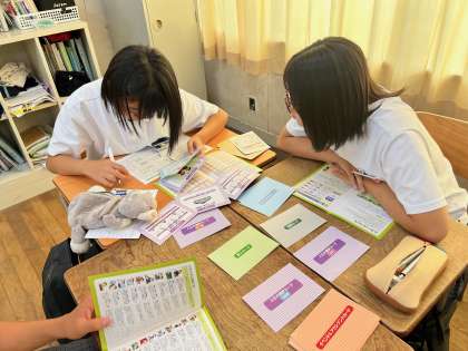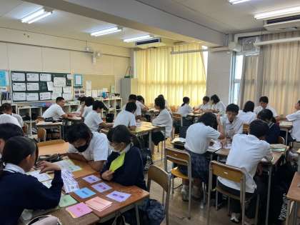 経済の授業では、「生活設計・マネープランゲーム」を行いました。4〜5人の班で行うグループワークとして、カードを引くことで、収入・基本生活支出・結婚・子ども・住居・ イベント&アクシデントとそれに伴う費用が決まります。結果をシートに記入することで、記録・計算・ 振り返りを行います。