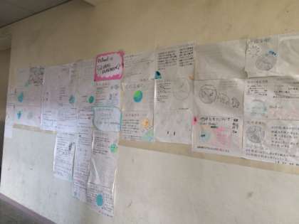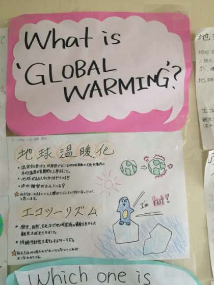 2年生では、「地球温暖化=Global Warming」についての研究発表が廊下に掲示されています。