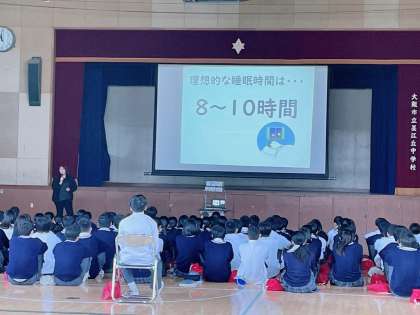 「よりよい睡眠をめざして〜電子メディアと上手につき合おう〜」をテーマに、昨年度のアンケートの結果や、中学生に必要な睡眠時間、寝不足による心身の症状、スムーズに寝つくための生活習慣についての講話がありました。