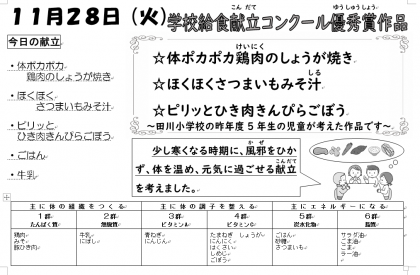 明日の献立は、「黒糖パン」・「キノコのクリームシチュー」・「キャベツのピクルス」・「りんご」などです。