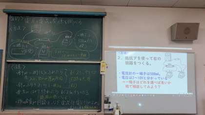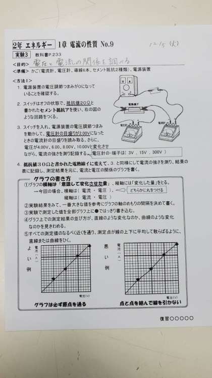 2年理科では、電流の性質を学んでいます。今回は、電圧と電流の関係を調べました。