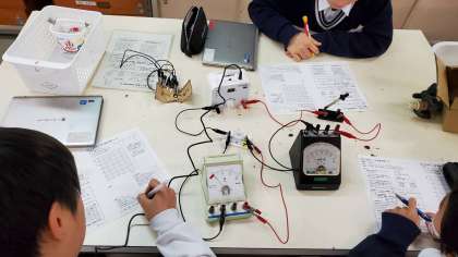 実験装置を自分たちでつないで、電圧と電流の関係を調べています。