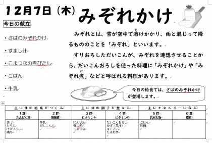 本日は二十四節気(にじゅうしせっき)の大雪(たいせつ)で、平地でも雪が降り始める頃とされています。給食は上記の通りです。