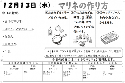 主食は「黒糖パン」で、「肉だんごと麦のスープ」は押麦・だいこん・にんじん・ほうれん草などが具材で、「さけのマリネ」、「みかん」などとともにおいしくいただきました。