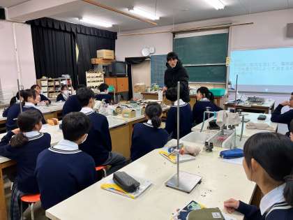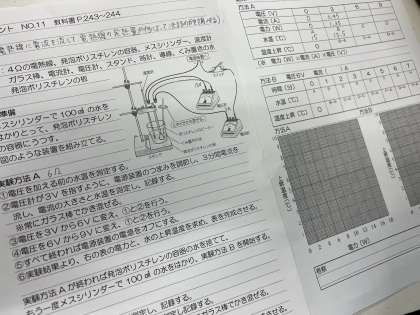 2年理科では、電熱線に電流を流して、電熱線の発熱量が何によって決まるかを調べる実験を行いました。みんな協力して、実験に参加できていますね。