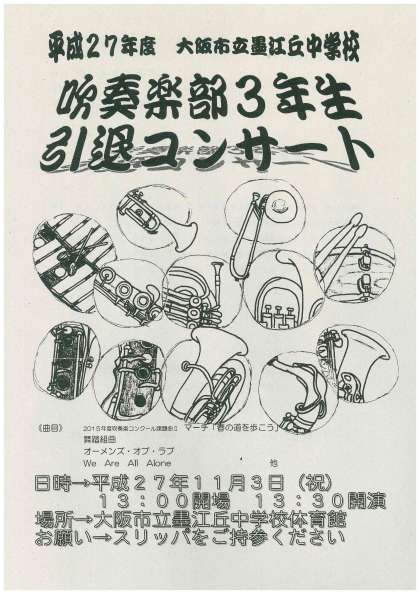 記念すべきコンサートになります。ぜひ、ご来校いただき、3年生も入った、最後の演奏をお楽しみください。