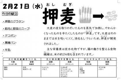 本日も3年生のみですが、「黒糖パン」、鶏肉・たまねぎ・グリンピース・マッシュルームなどの「押麦のグラタン」、キャベツ・大根・にんじん・パセリなどの「豚肉と野菜のスープ」、「デコポン」などをおいしくいただきました。
