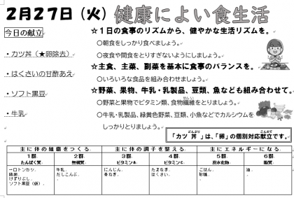 なたね油で十分にあげたとんかつと鶏卵・たまねぎ・にんじんなどの「かつ丼」、「はくさいの甘酢あえ」、「ソフト黒豆」などをおいしくいただきました。