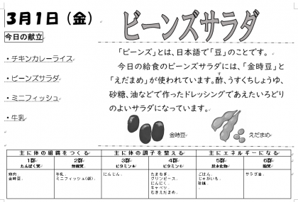 鶏肉・じゃがいも・たまねぎ・にんじん・にんにく・グリンピースなどの「チキンカレーライス」、「ビーンズサラダ」、「ミニフィッシュ」などをおいしくいただき、体も温まりました。