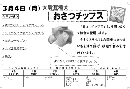 「黒糖パン(ハーフサイズ)」、紅ざけ(フレーク)・ベーコン・たまねぎ・にんじん・むき枝豆・マッシュルームなどの「さけのクリームスパゲッティ」、「キャベツときゅうりのサラダ」、新登場の「おさつチップス」などをおいしくいただきました。