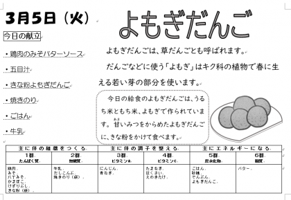 「ごはん」、赤みそ・八丁みそ・バターなどで味付けされた「鶏肉のみそバターソース」、かまぼこ・たまねぎ・はくさい・にんじん・青ねぎ・えのきたけなどの「五目汁」は温かく、「きな粉よもぎだんご」、「焼きのり」などをおいしくいただきました。