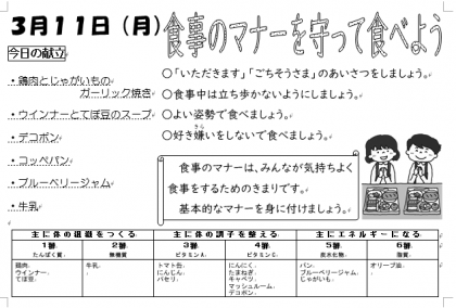 明日の献立は、「ごはん」、「いわしフライ」、「みそ汁」、「牛ひじきそぼろ」などです。3年生は中学校生活最後の給食となります。感謝の気持ちを込めて味わってください。